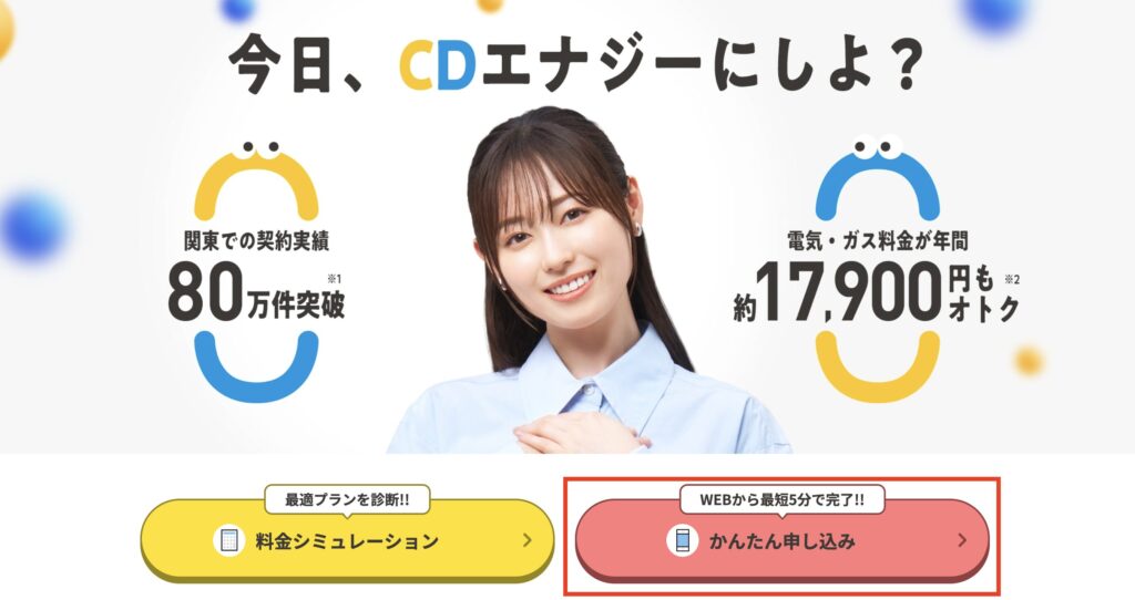 まずは、CDエナジーの公式ページにアクセスして、「かんたん申し込み」をクリックします。