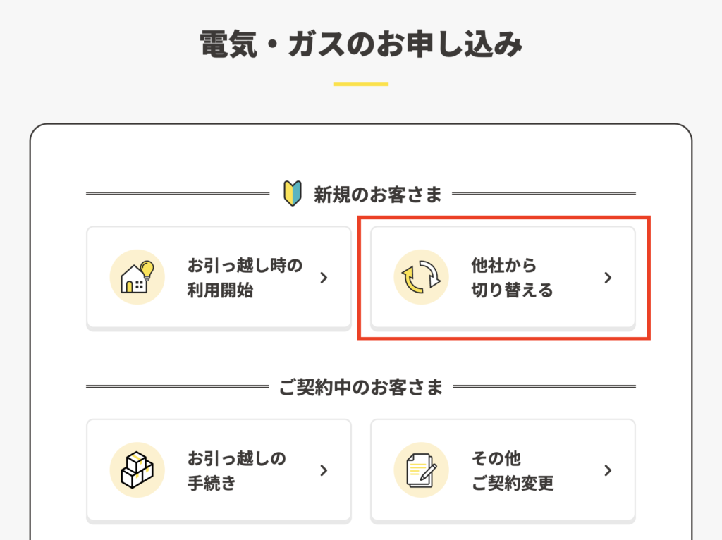 ご自身の状況にあう項目をクリックします。ここでは、「他社から切り替える」を例に進めていきます。
