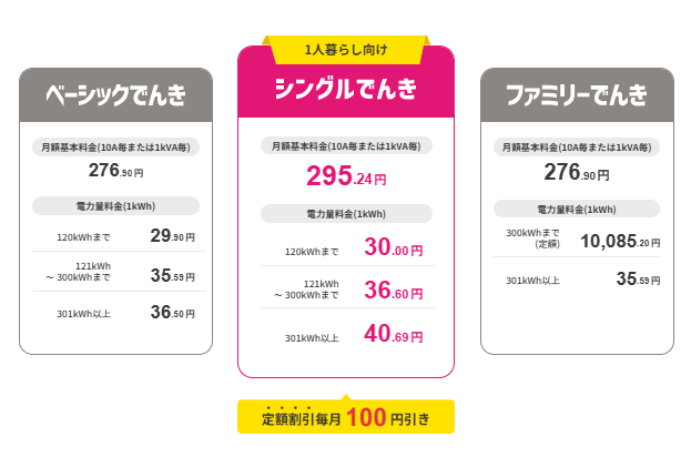 一人暮らし向けプラン「シングルでんき」は毎月100円割引