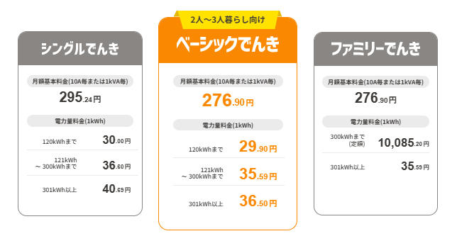 リモートワークで在宅時間が長い人、ペットを飼っていて電気使用量が多い一人暮らしの方などは、ベーシックでんきを選ぶとよいでしょう。