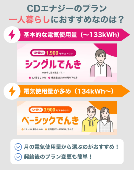 CDエナジーは一人暮らしにはシングルでんきが推奨されていますが、実はある程度電気を使う方なら「ベーシックでんき」の方がお得になります。
