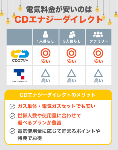 CDエナジーと東京ガスのともに代表的なプラン(電気:CDエナジーの「ベーシックでんき」東京ガスの「基本プラン」、ガス:CDエナジーの「ベーシックガス」東京ガスの「一般料金」)ではCDエナジーのほうが安くなっています。