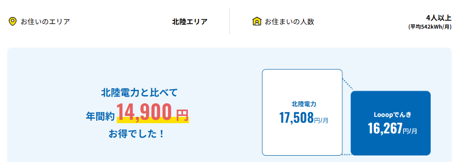 四人暮らしのファミリー世帯のLooopでんきと北陸電力の料金の比較は、以下の表のとおりです。