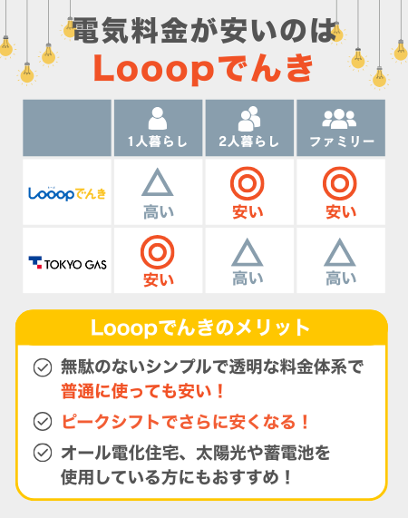 さまざまな角度から料金を比較した結果、1人暮らしの場合は東京ガスが安く、2人暮らし~ファミリーの電気使用量が多い仮定ではLooopでんきの方が安い結果となりました。