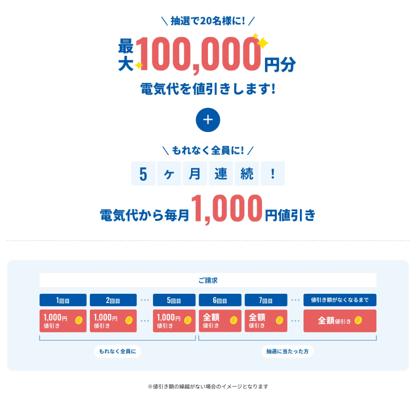 もれなく全員に電気代5,000円分割引+抽選で電気代最大100,000円割引のチャンス