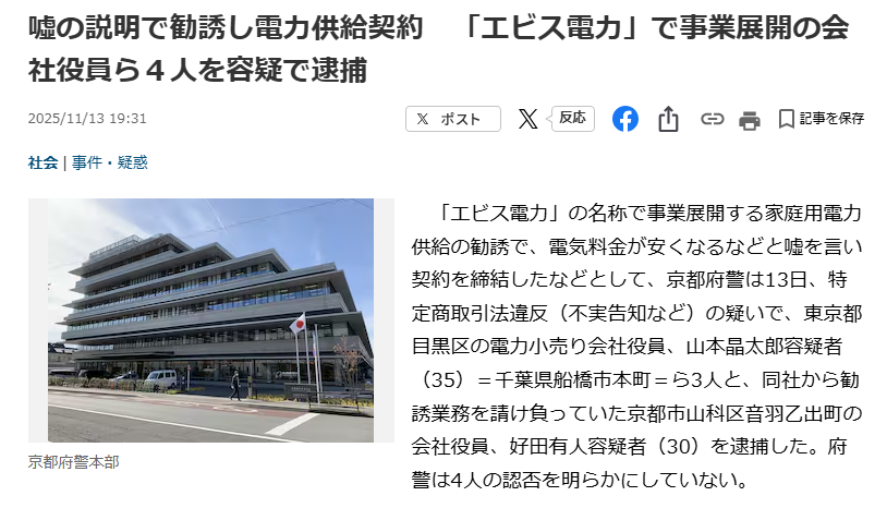 2025年11月には「ヱビス電力」の役員ら4人が逮捕