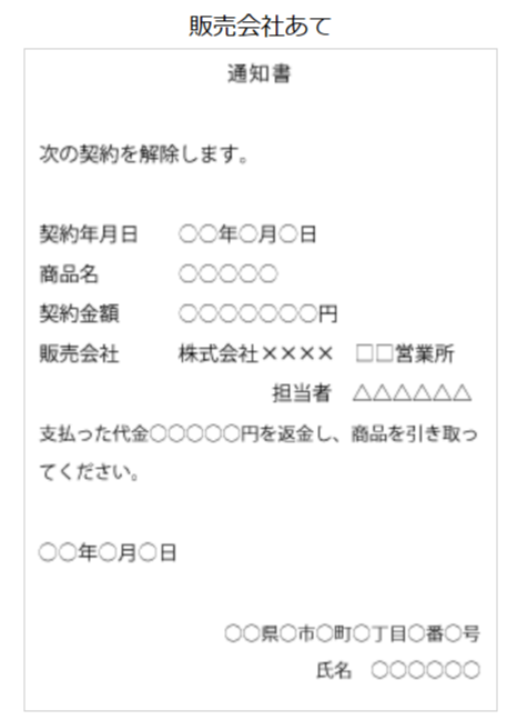 契約年月日、契約者名、購入商品名、契約金額等、クーリング・オフの通知を発した日