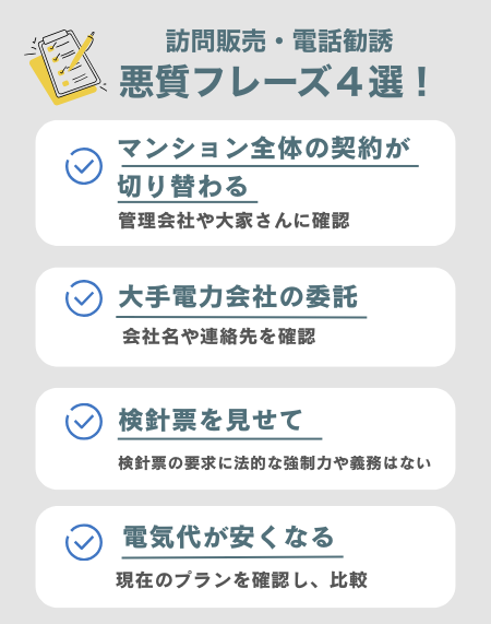 電気・ガスの訪問販売や電話勧誘でよく使われるフレーズとその対策について紹介します。