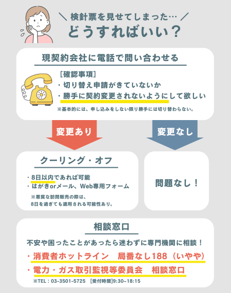 検針票を見せてしまった場合、まずはすぐに現在の契約会社に問い合わせ契約内容の確認をしましょう。申し込みをしてしまった場合でも、8日以内であればクーリング・オフで契約解除できます。