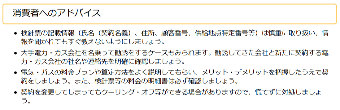 国民生活センターは被害に遭わないために、検針票の情報は教えない、契約会社や契約内容をよく確認するよう注意を促しています。