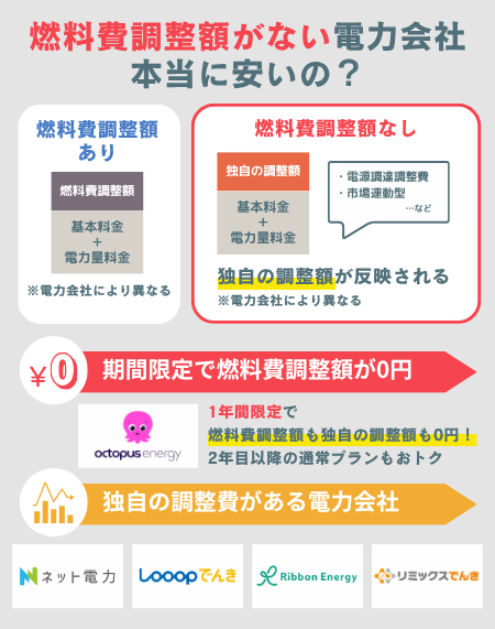 例えばオクトパスエナジーのシンプルオクトパスは、12か月間の燃料費調整額が0円になります。他の電力会社と違って、代わりに独自の調整費がかかるといったこともありません。