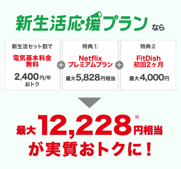 | 新生活応援プラン 【一人~二人暮らしにおすすめ!】 | ・ガスとまとめると基本料金がずっと無料 ・冷蔵宅配食FitDish 新規申込で初回2ヶ月(最大4,000円)値引き ・Netflixプレミアムプランで最大5,828円相当がおトク※ |