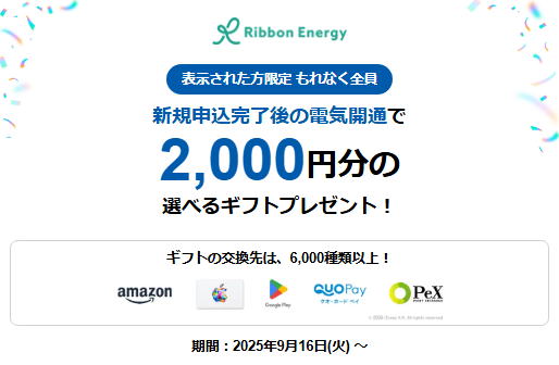 当サイト経由でリボンエナジーに新規申込後、電気が開通すると2,000円分の選べるギフトがプレゼントされます。