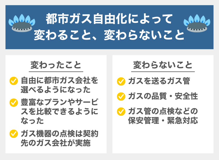 ガスの自由化以後には、自由化以前から変わったこともあれば、変わらないこともあります。それぞれ以下の通りです。