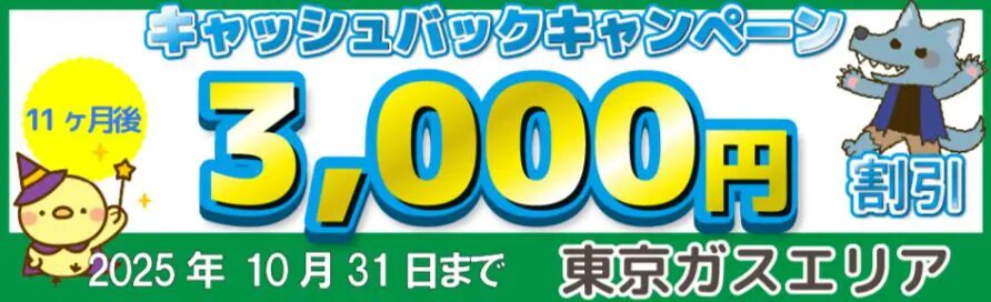 キャンペーンの開催期間は2025年10月31日まで。キャンペーンを実施している数少ないガス会社ですので、 気になった方は早めのお申し込みがオススメです。