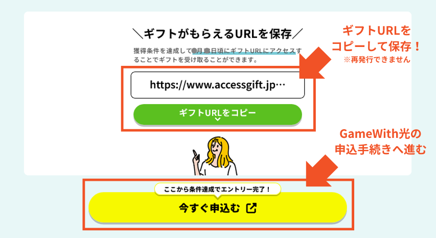 | 1.キャンペーンページへアクセス ⇒GameWith光を申し込む | キャンペーンページで発行される 「ギフトURL」をコピーして保存 |