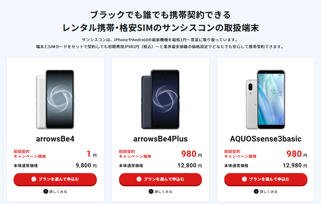 端末代が1円〜で購入できるのも、サンシスコンのメリットです。例えば2025年11月現在では、本体価格9,800円の「arrowsBe4」が、初回契約キャンペーン価格で1円となっています。