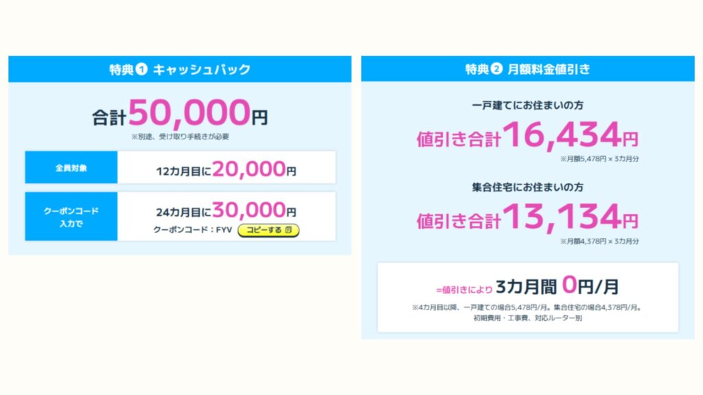 「キャッシュバック特典&月額割引」が受けられる